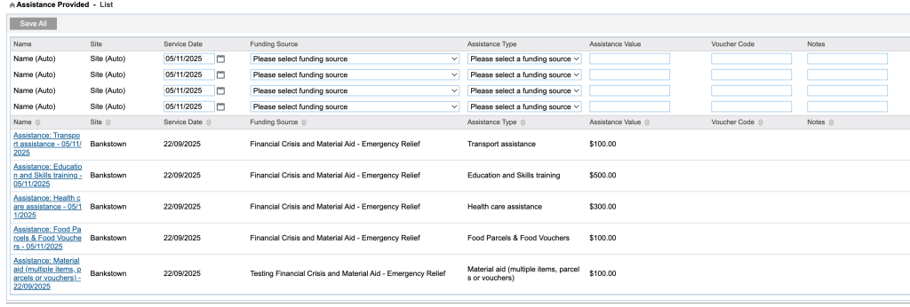 For example, if the client has received a food parcel and a Telstra voucher, two separate Assistance Provided records must be created: one for the food parcel, and another for the Telstra voucher.