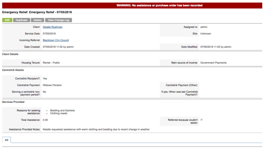 The Emergency Relief Assistance provided record contains detailed information relating to the assistance provided to a particular client.
